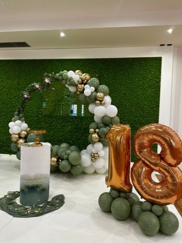Allestimento 18 Anni Elegante Verde Salvia e Oro Rosé – Balloon Arch Organico con Backdrop Green Wall