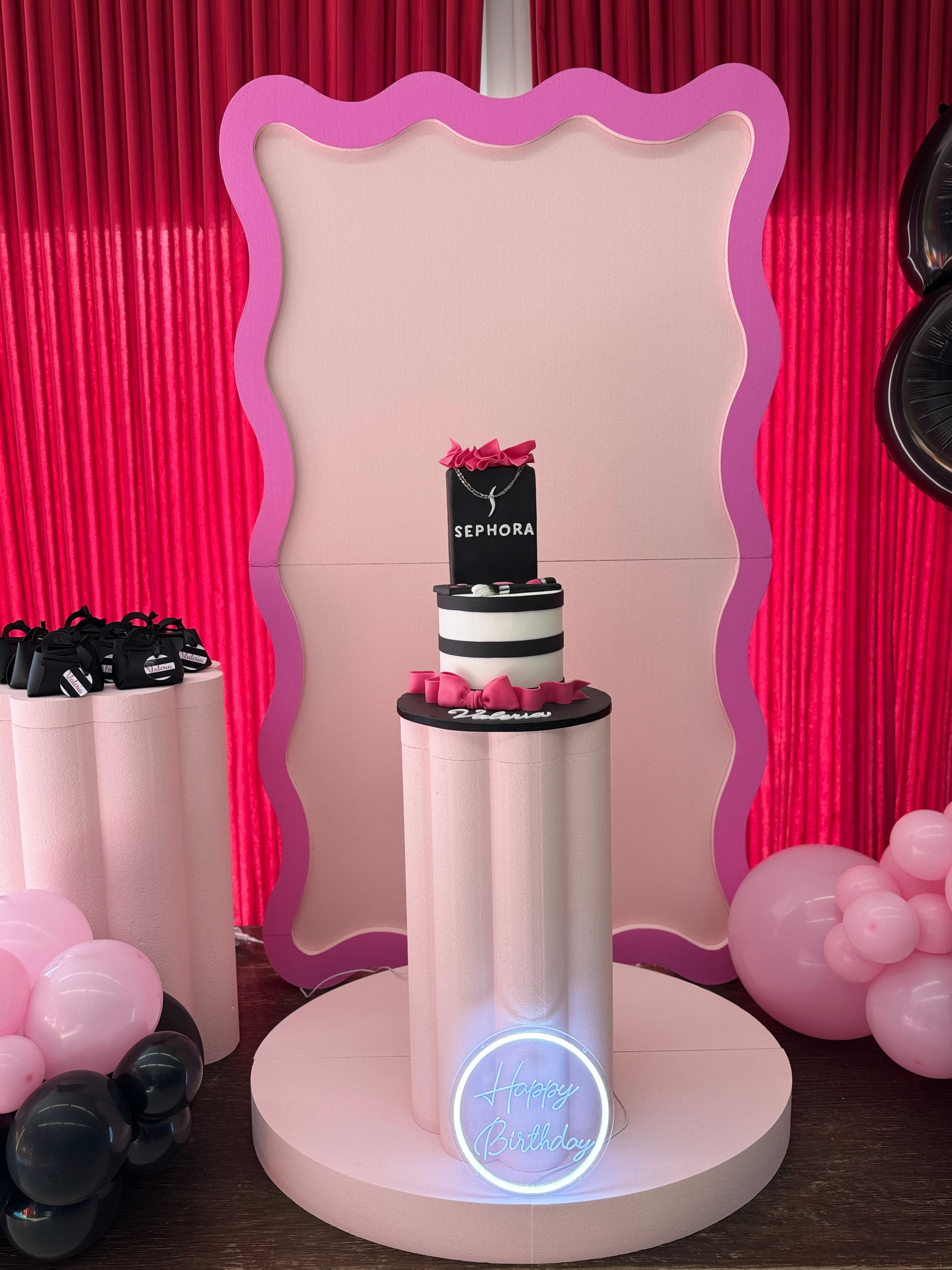 Allestimento 18 Anni Glamour Rosa e Nero – Sweet Table Fashion con Pannello Scenografico e Neon