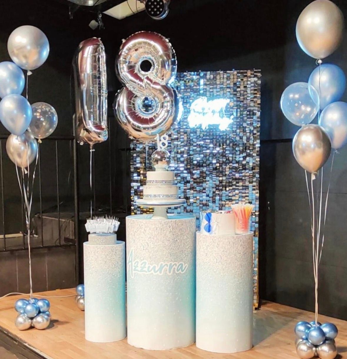 Allestimento 18 Anni Luxury Azzurro e Argento – Shimmer Wall con Neon e Pedane Scenografiche
