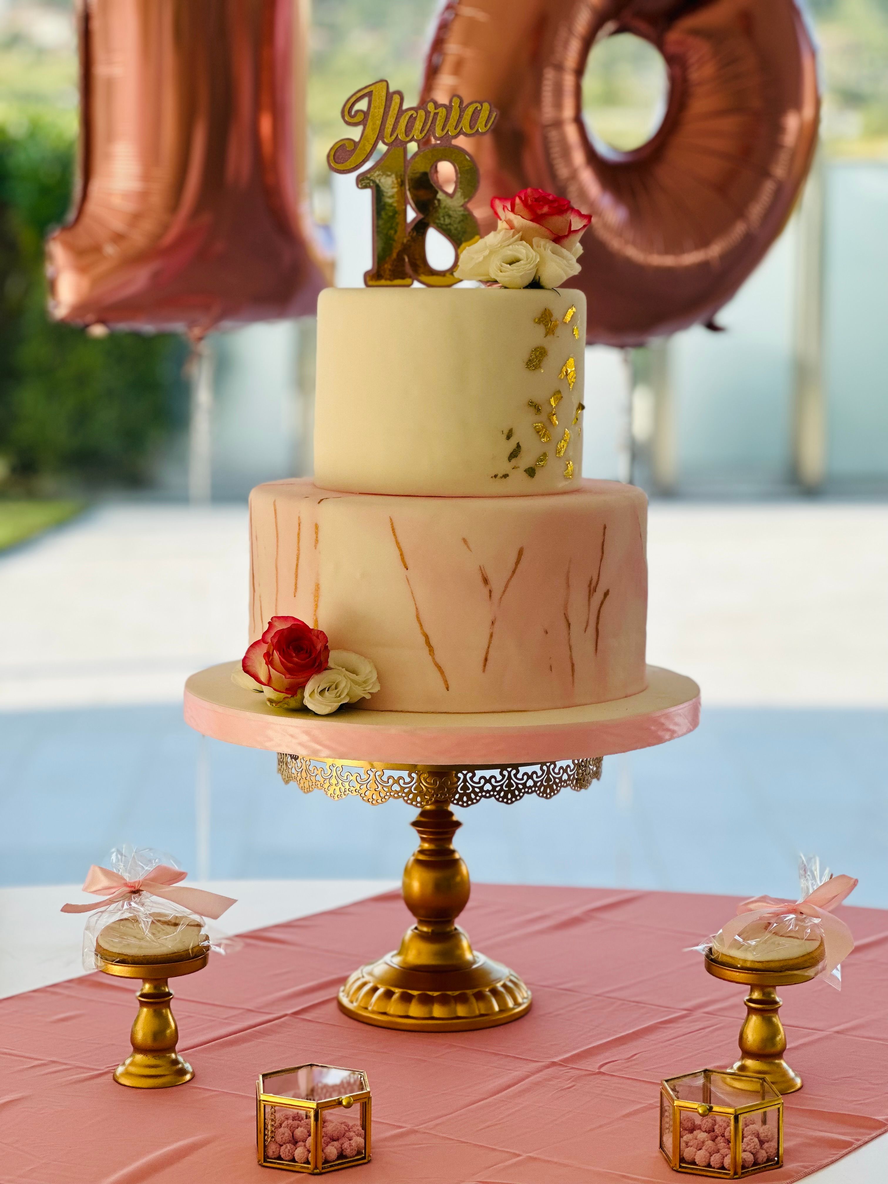 Il numero 18 in oro rosé sullo sfondo aggiunge un tocco glamour, mentre i dettagli tessili in tulle rosa creano movimento e leggerezza.