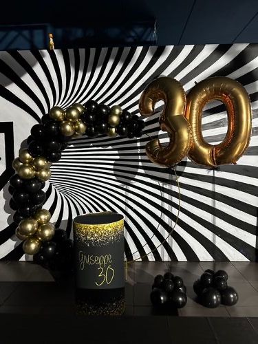 Allestimento 30 Anni Black & Gold Luxury – Balloon Arch con Backdrop Optical e Party Night Setup