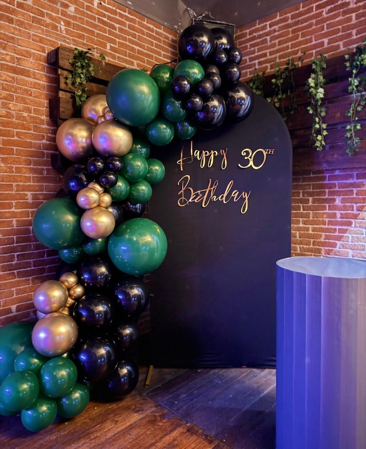 Allestimento Compleanno 30 Anni Luxury Nero e Oro – Backdrop con Scritta Personalizzata e Arco Balloon Organico