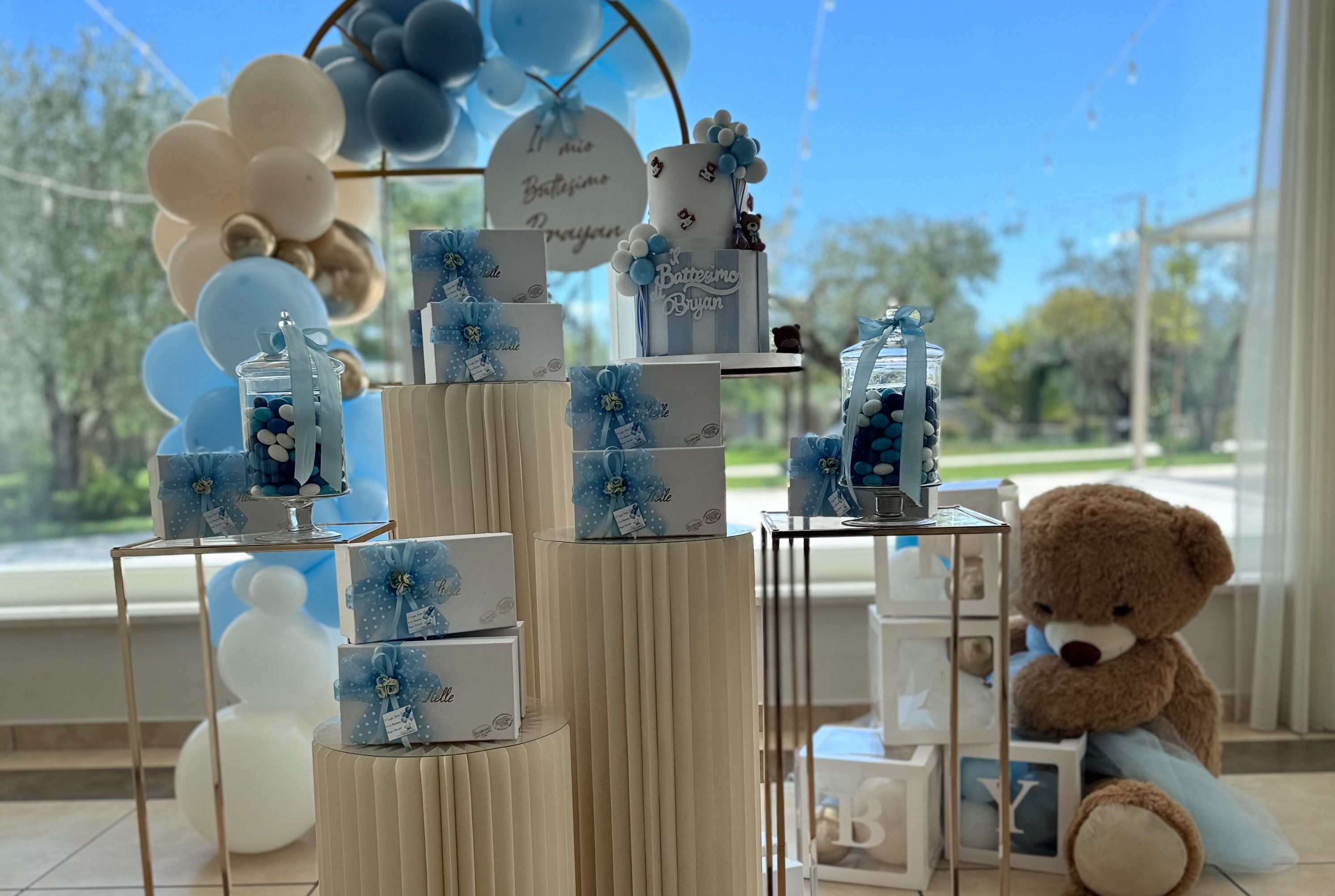🎀 Toni delicati dell’azzurro e del bianco hanno avvolto la scenografia, con eleganti piedistalli decorati da gift box coordinate, una torta a tema, jar di confetti e un grande arco di palloncini in sfumature pastello. A completare il tutto, un dolce orsacchiotto ha aggiunto un tocco di tenerezza speciale.