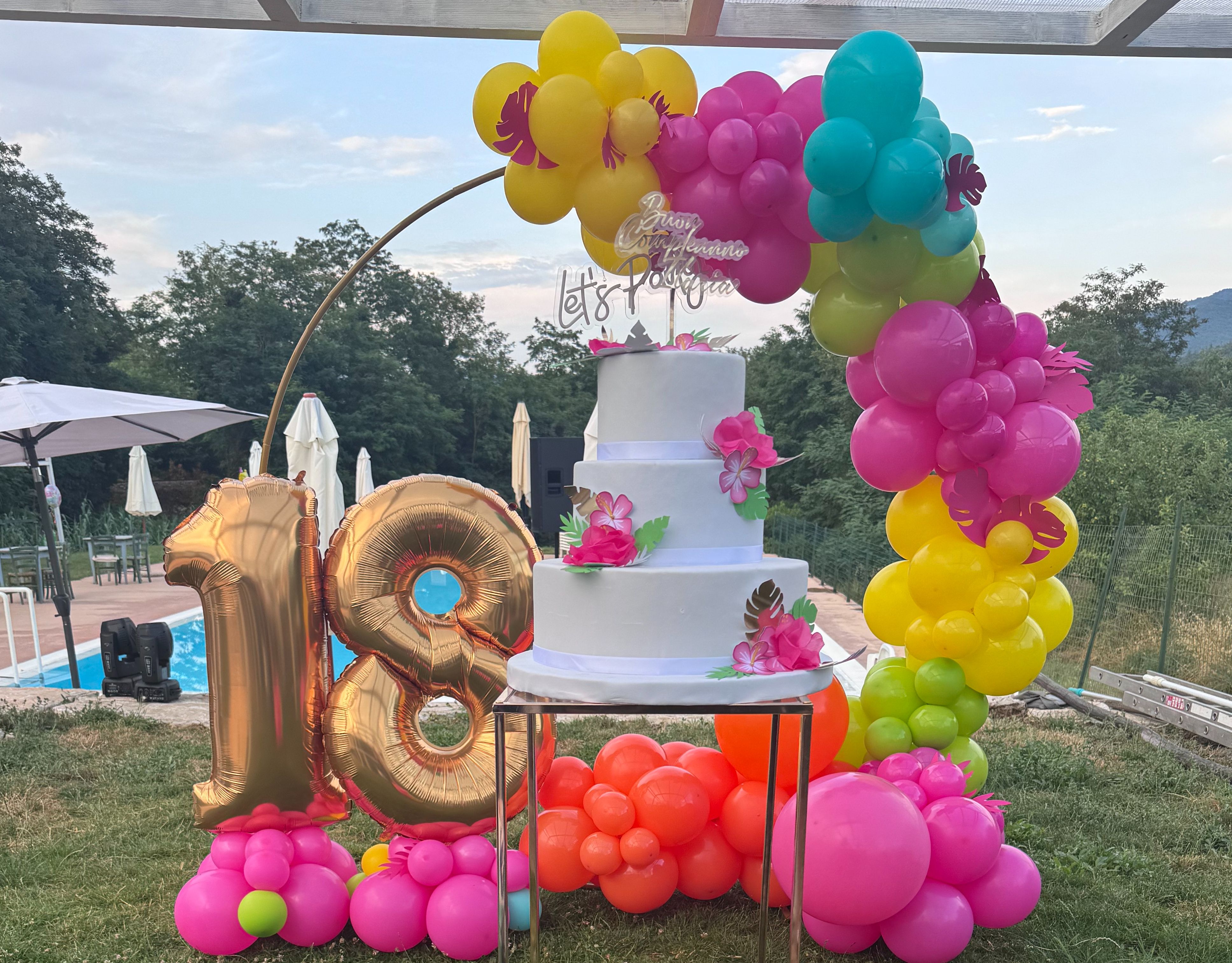 🎀 Una maestosa torta bianca a più piani decorata con fiori hawaiani, incorniciata da un arco di palloncini nei toni vivaci del fucsia, giallo, arancio e turchese, con il grande numero “18” dorato a dare ancora più risalto alla festa.