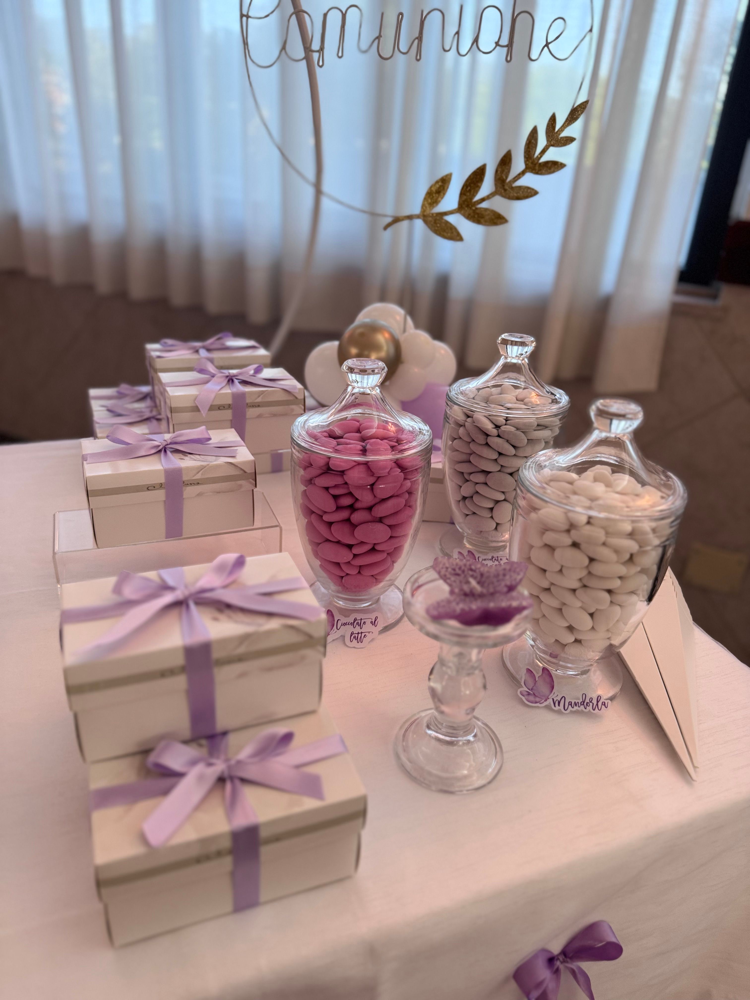 🎀 Un tavolo impreziosito da gift box con nastri lilla, vasi di vetro colmi di confetti nei toni bianco, rosa e lilla, e un elegante arco di palloncini pastello che incornicia la scenografia. Morbido tulle e dettagli in oro hanno aggiunto un tocco di luce e raffinatezza.